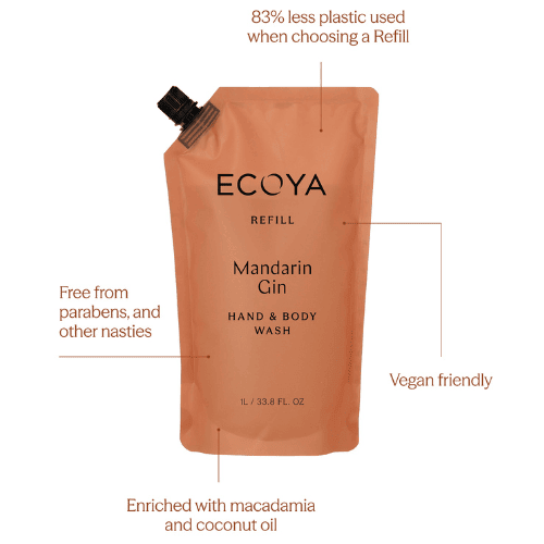 ECOYA Mandarin Gin Hand & Body Wash Refill 1L – A nourishing and deliciously fragrant Hand & Body Wash designed to gently wash and cleanse your skin. Layer your fragrance and use together with our Hand & Body Lotion