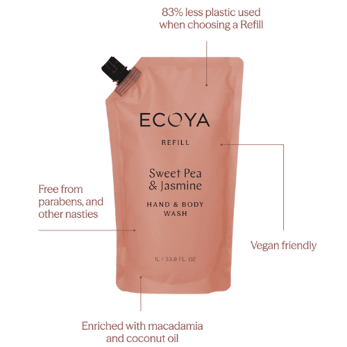 ECOYA Sweet Pea & Jasmine Hand & Body Wash Refill 1L – A nourishing and deliciously fragrant Hand & Body Wash designed to gently wash and cleanse your skin. Layer your fragrance and use together with our Hand & Body Lotion