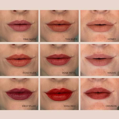 Chilli Red ,Crimson ,Deep Plum ,Honey, ,Mauve ,Pink Nude ,Rose Nude ,Rose Petal ,Tan Nude |